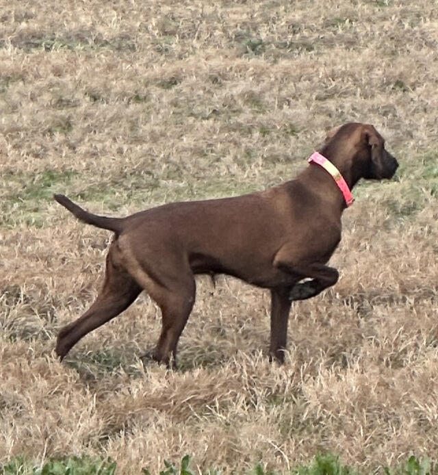 Brandy is a pointing machine with lots of style. Strong retrieving & prey drive. She's rock solid steady & naturally backs other dogs, with 3 versatile champions on her pedigree